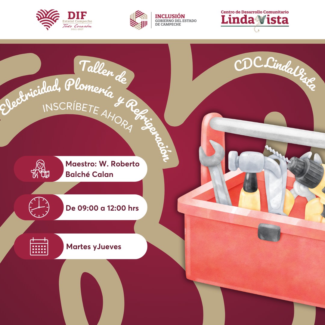 La Secretaría de Inclusión del Gobierno del Estado, bajo la titularidad de la Lic. Ana Alicia Mex Soberanis, invita a la ciudadanía a participar en los talleres gratuitos de Electricidad, Plomería y Refrigeración, que se llevarán a cabo los martes y jueves de 9:00 a 12:00 horas en el Centro de Desarrollo Comunitario Lindavista. Estos talleres están diseñados para fortalecer las habilidades técnicas de los participantes y brindar herramientas que les permitan acceder a mejores oportunidades laborales. La inscripción está disponible en Calle Brisas 26, Lindavista CTM, a un costado de la cancha y de la bomba de SMAPAC. La Lic. Ana Alicia Mex Soberanis, en coordinación con el Instituto de Capacitación para el Trabajo del Estado de Campeche (ICATCAM), refrenda el compromiso de la Secretaría de Inclusión para promover la capacitación y el desarrollo de competencias que favorezcan la inclusión social y económica de la población campechana. Con estas acciones, la Secretaría de Inclusión continúa trabajando como un puente de acceso a programas y oportunidades que contribuyen al crecimiento personal y profesional de la comunidad.a.