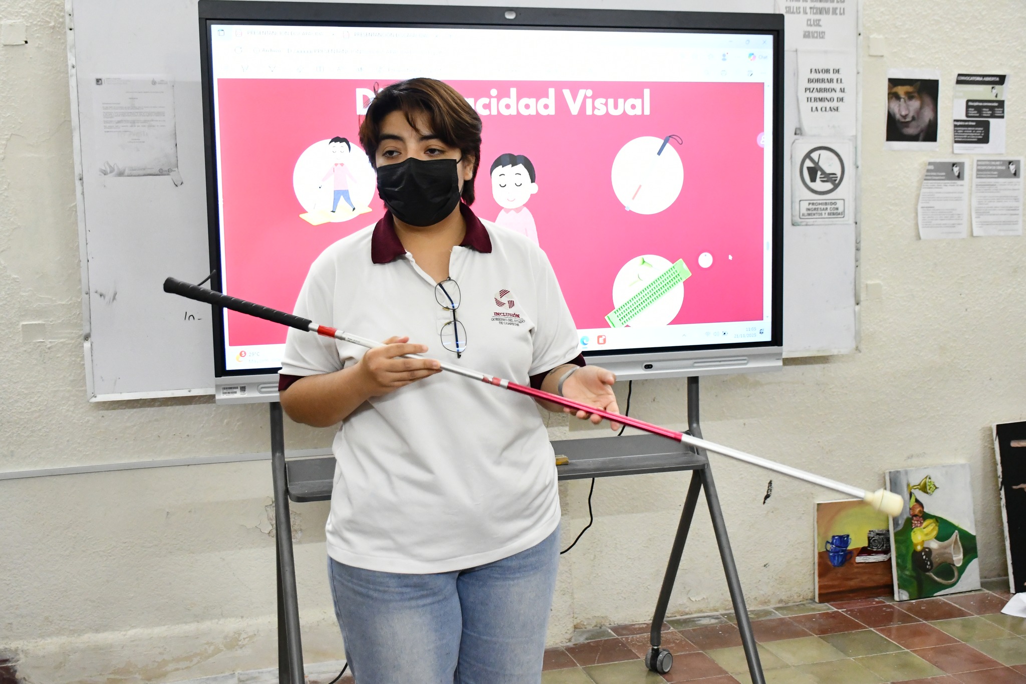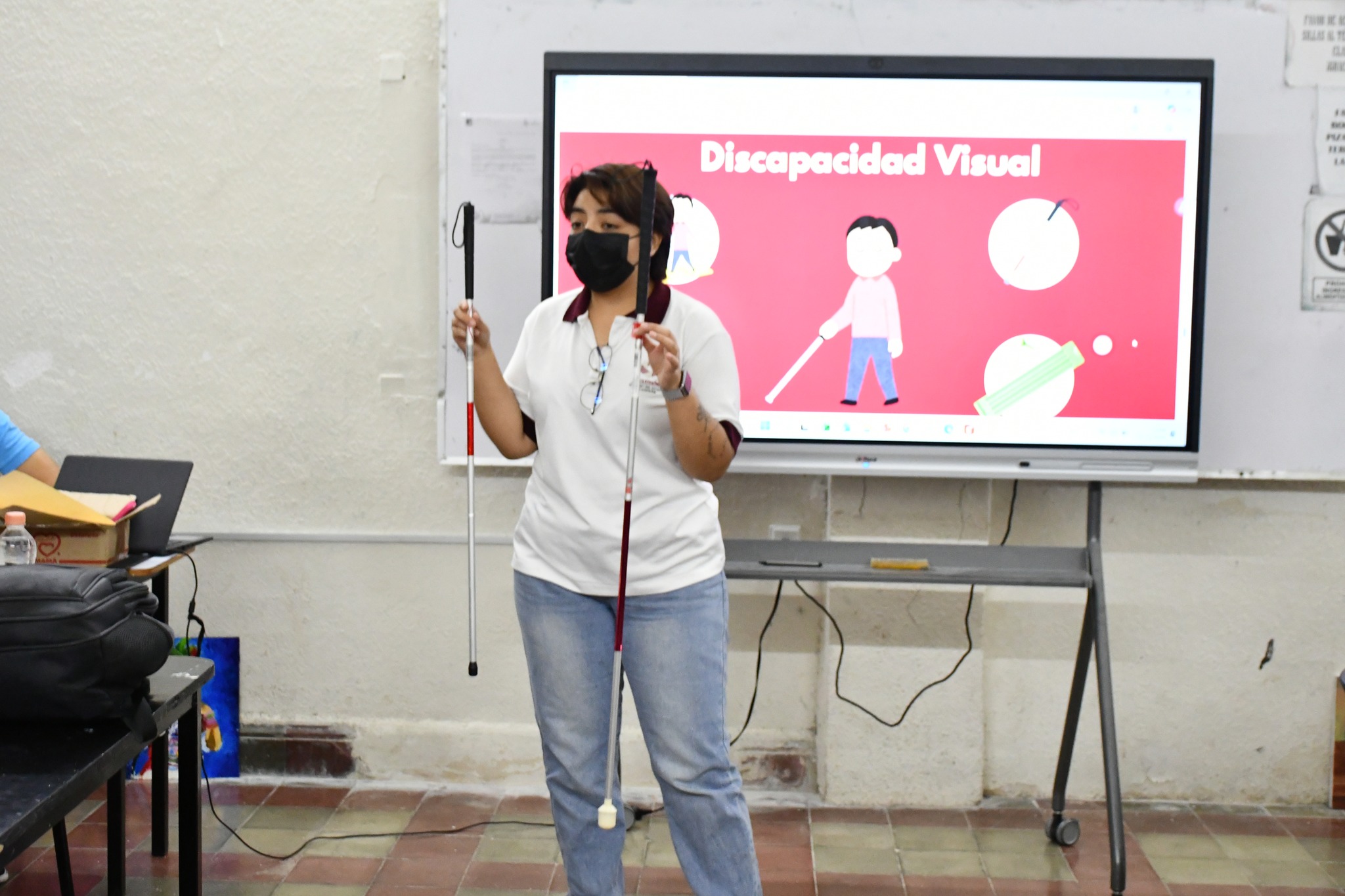 La Secretaría de Inclusión, encabezada por la Licda. Ana Alicia Mex Soberanis impartió en el Instituto Campechano la sesión “Discapacidad: Un cambio de percepción”, dirigida a la comunidad estudiantil, de la carrera de Artes Visuales, con el propósito de fortalecer la sensibilización y el respeto hacia las personas con discapacidad en los espacios educativos y comunitarios. La actividad fue facilitada por la Dirección para la Discapacidad, quien abordó los distintos tipos de discapacidad, la importancia de la accesibilidad y el uso adecuado del lenguaje incluyente. Asimismo, se llevaron a cabo dinámicas prácticas con bastones y regletas para escribir en sistema braille, que permitieron a la comunidad estudiantil comprender mejor diversas formas de movilidad y comunicación utilizadas por personas con discapacidad visual. Estas acciones forman parte del compromiso permanente del Gobierno de Todos, que encabeza la gobernadora Layda Sansores, para promover entornos educativos más accesibles, empáticos y libres de discriminación, consolidando un Campeche verdaderamente incluyente.